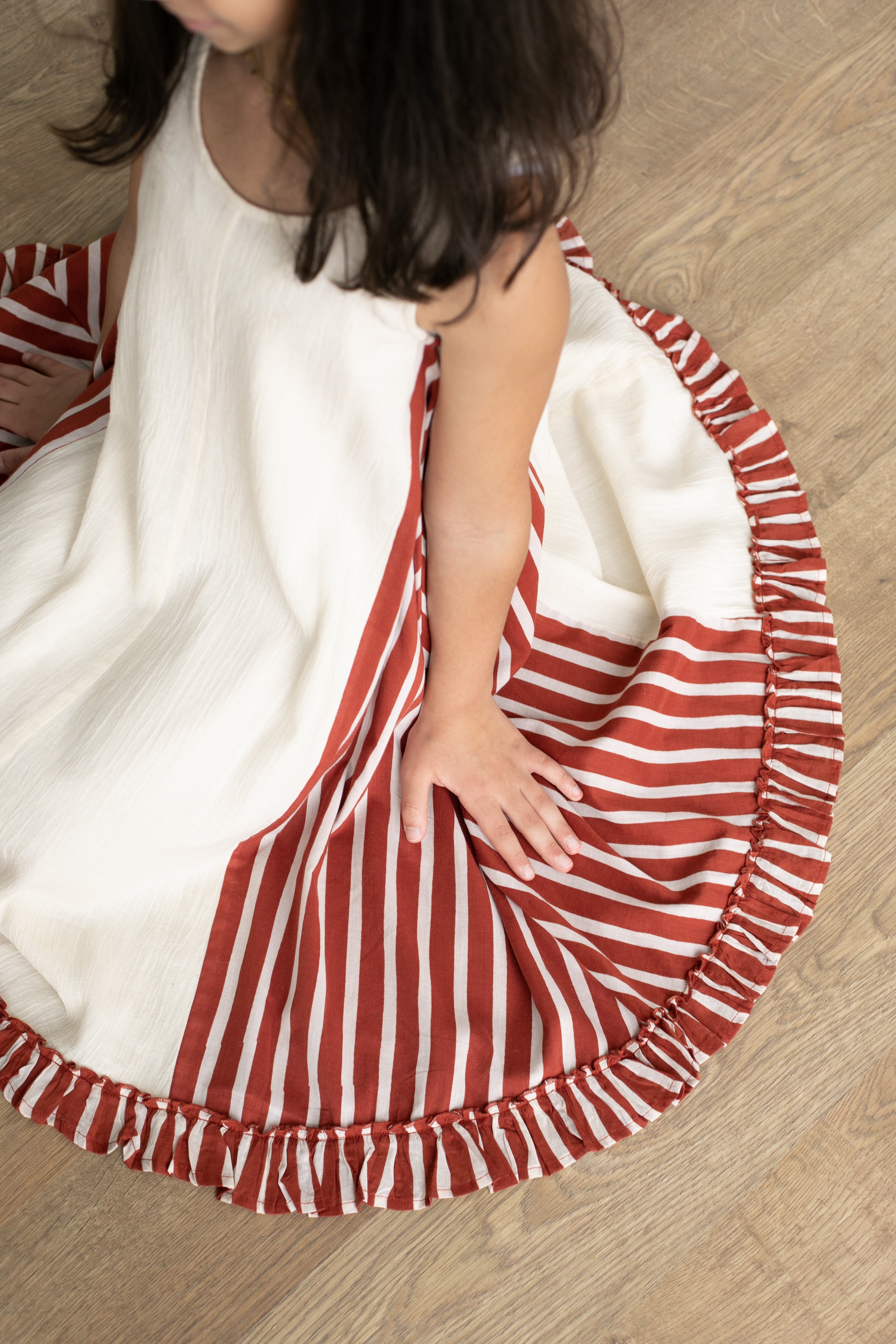 A soft long free falling dress with contrasting color shades and flared hem to give you a free walk.