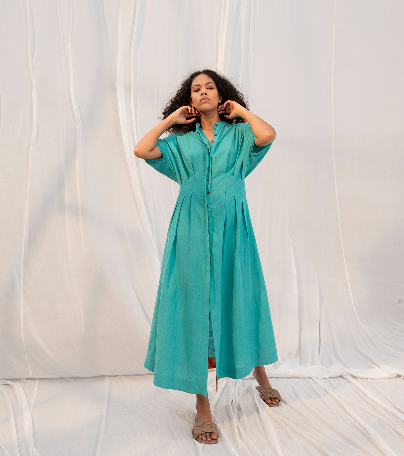 An ode to the autumnal rain, only passing by. Twirl in transition wearing this turquoise kimono button down dress with pleats on front and back. It has ikat detailing on the inside.