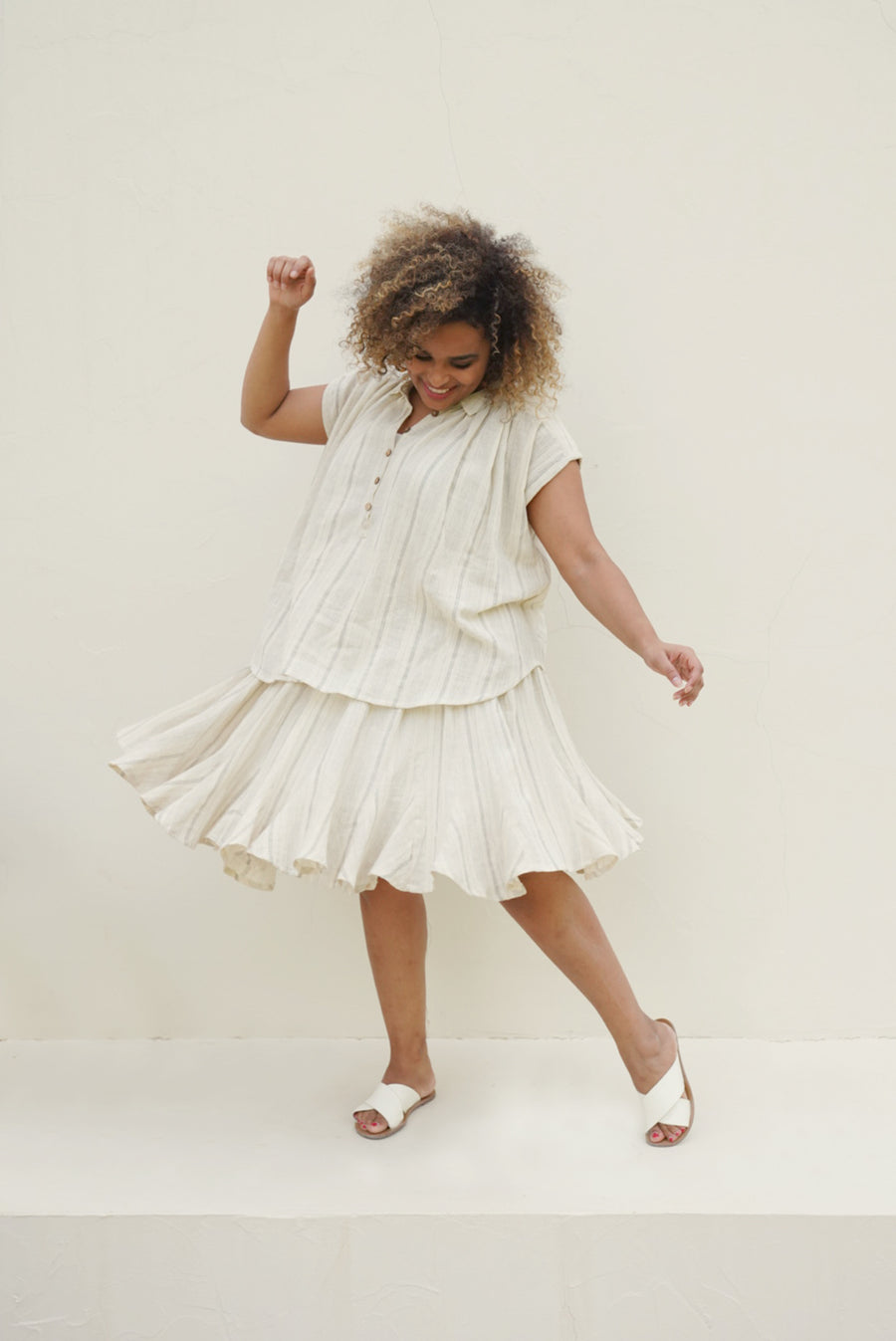 A set of a short cotton skirt with ruffles along with embroidered details at the waist.  Comes in a rear zip fastening and gathering under the waist which gives the skirt a flared effect. Effortless and cool, this button-front top has an easy, slightly oversized fit and just-right stripes.