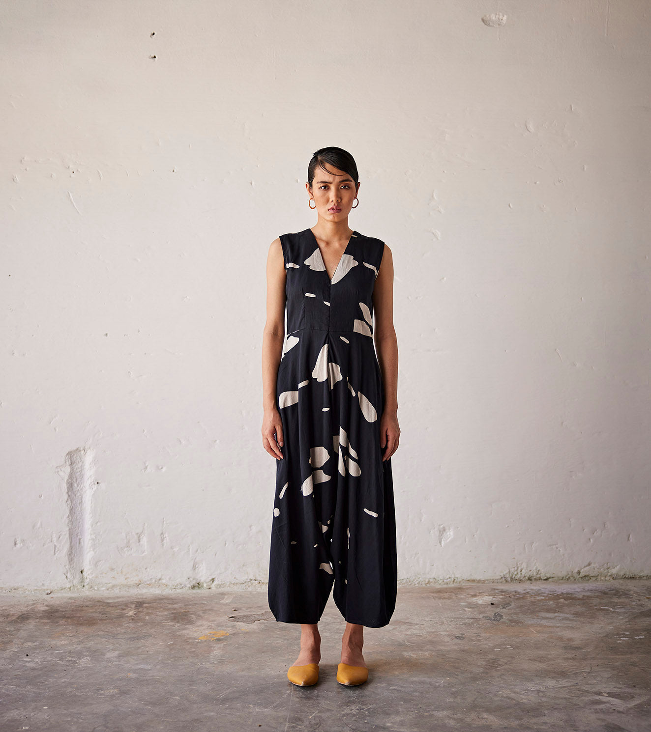 Black terracota print mul jumpsuit with a concealed zipper opening and a V neckline.