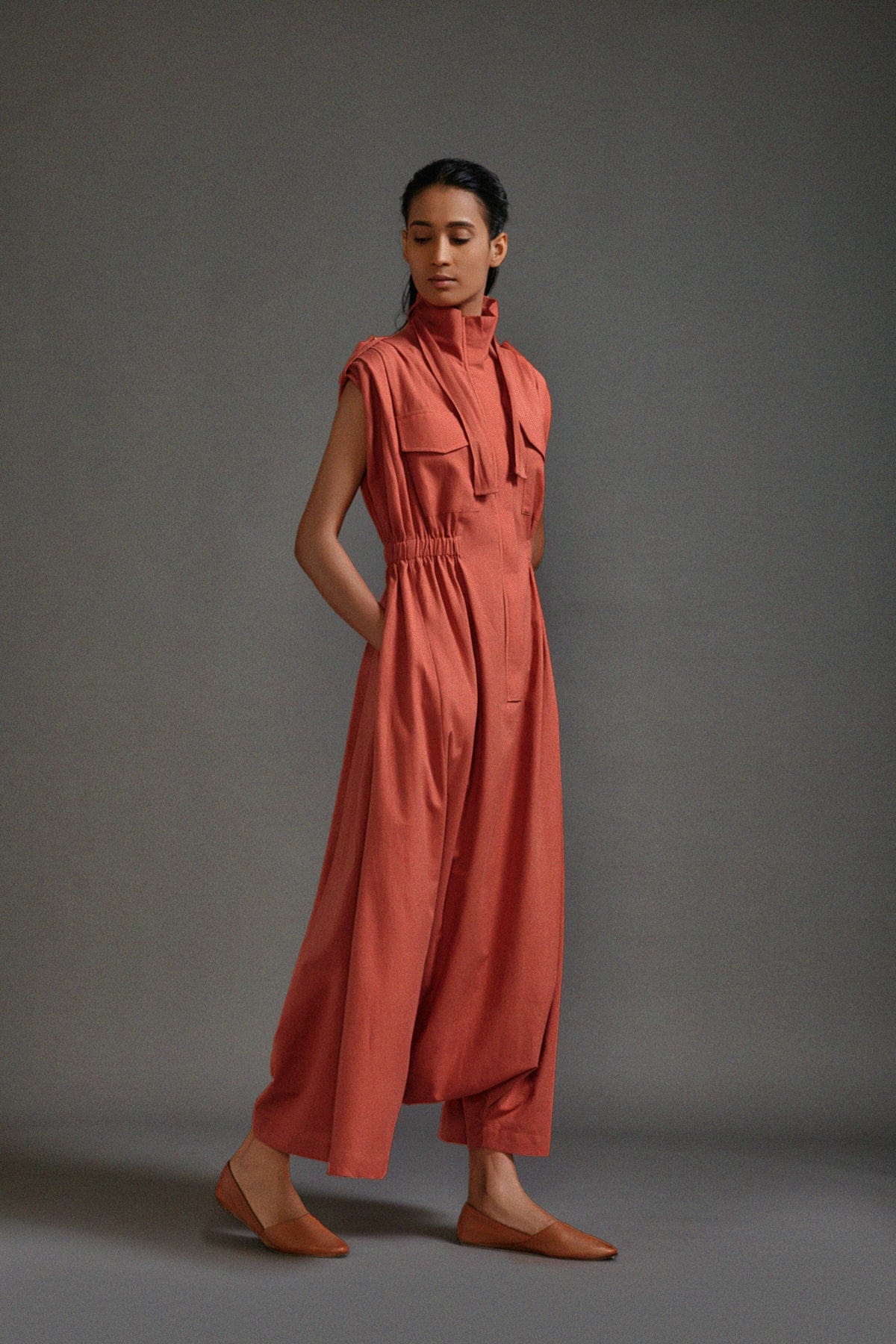 A Classic mati jumpsuit with high-collar and safari details. Front zipper opening, Side pockets and elastic at the waist for a comfort fit.