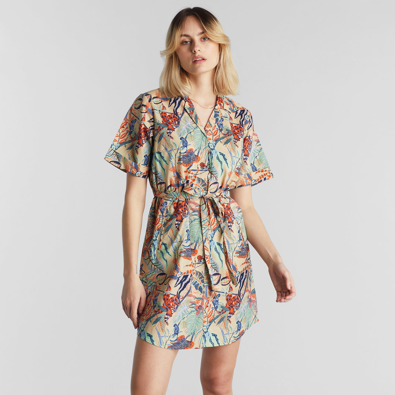 Loose fitted shirt dress with short sleeves and jetted pockets at front. Holiday inspired collar and with a belt in the waist to adjust as desired.