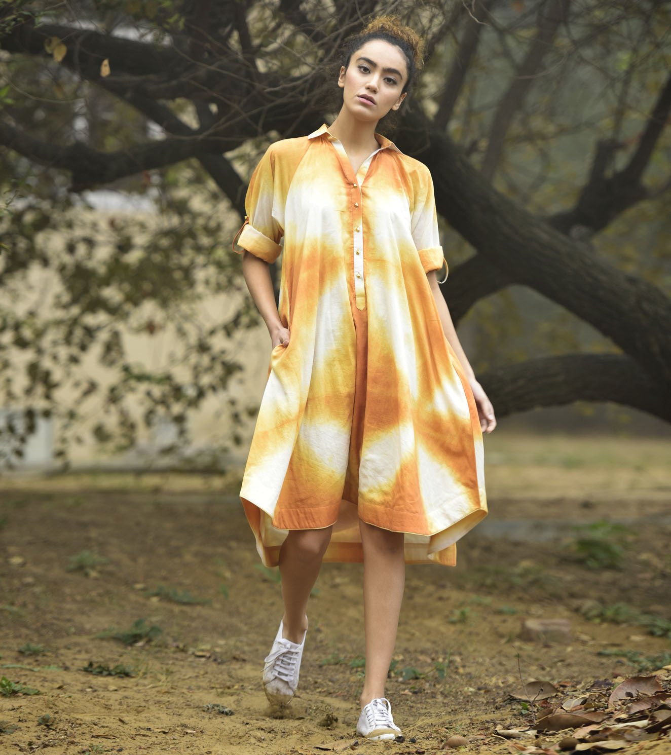 A supremely comfortable silhouette handcrafted in clamp-dyed shibori, the dress has classic collars, front buttoned placket, side pockets and rollup sleeves.