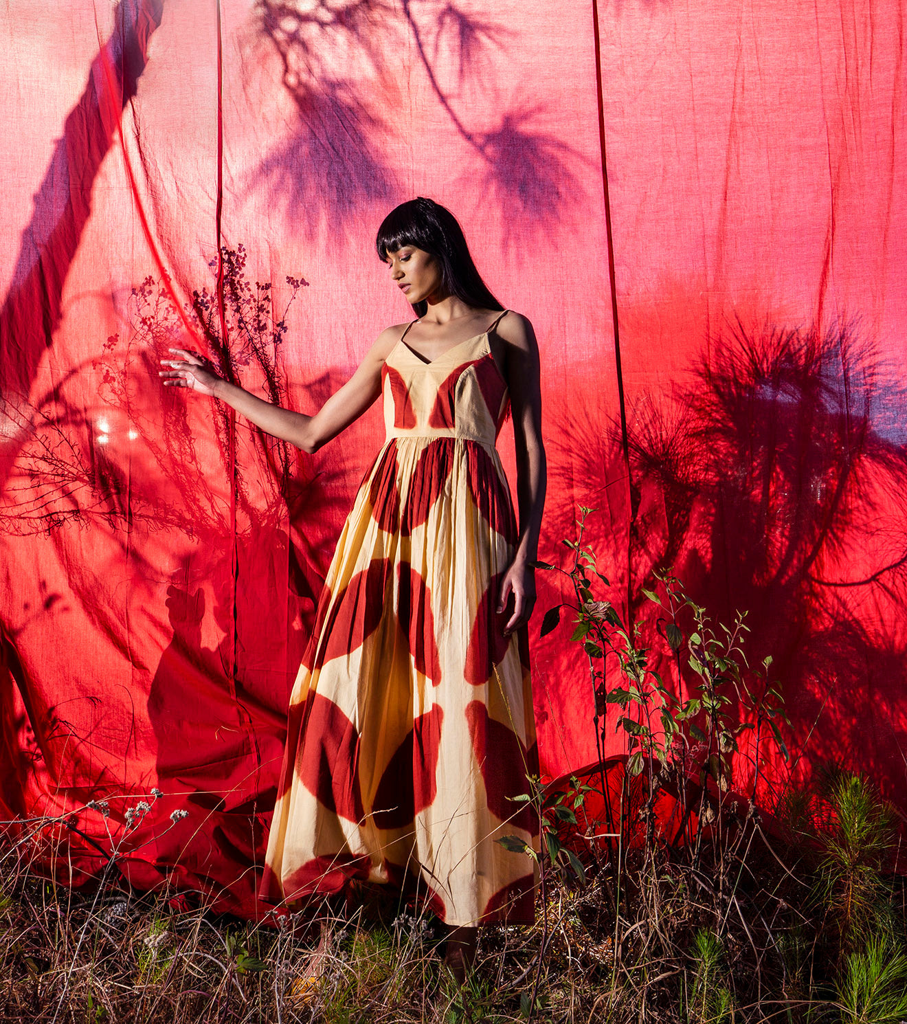 Beautiful, wildflower, grow untamed. Shibori dyed maxi dress with noodle straps and a deep neckline. She comes with a back buttoned closure.