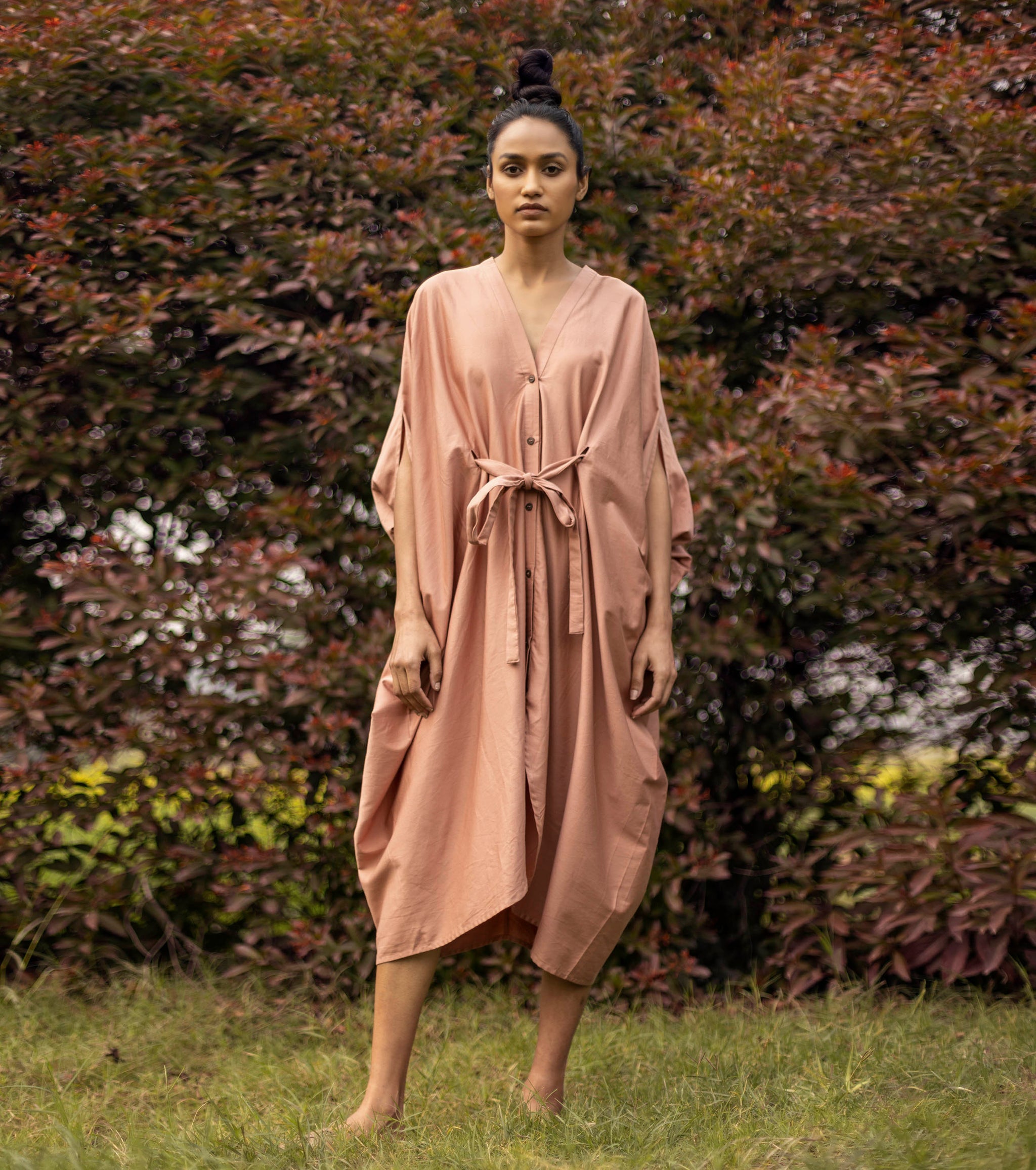 Flowing through the valleys, crossing varied terrains, gentle winds whistle a melody in your ear. Let your spirit roam free in the unconfined cut of this easy Kaftaan, accentuated with a waist band and wooden buttons.