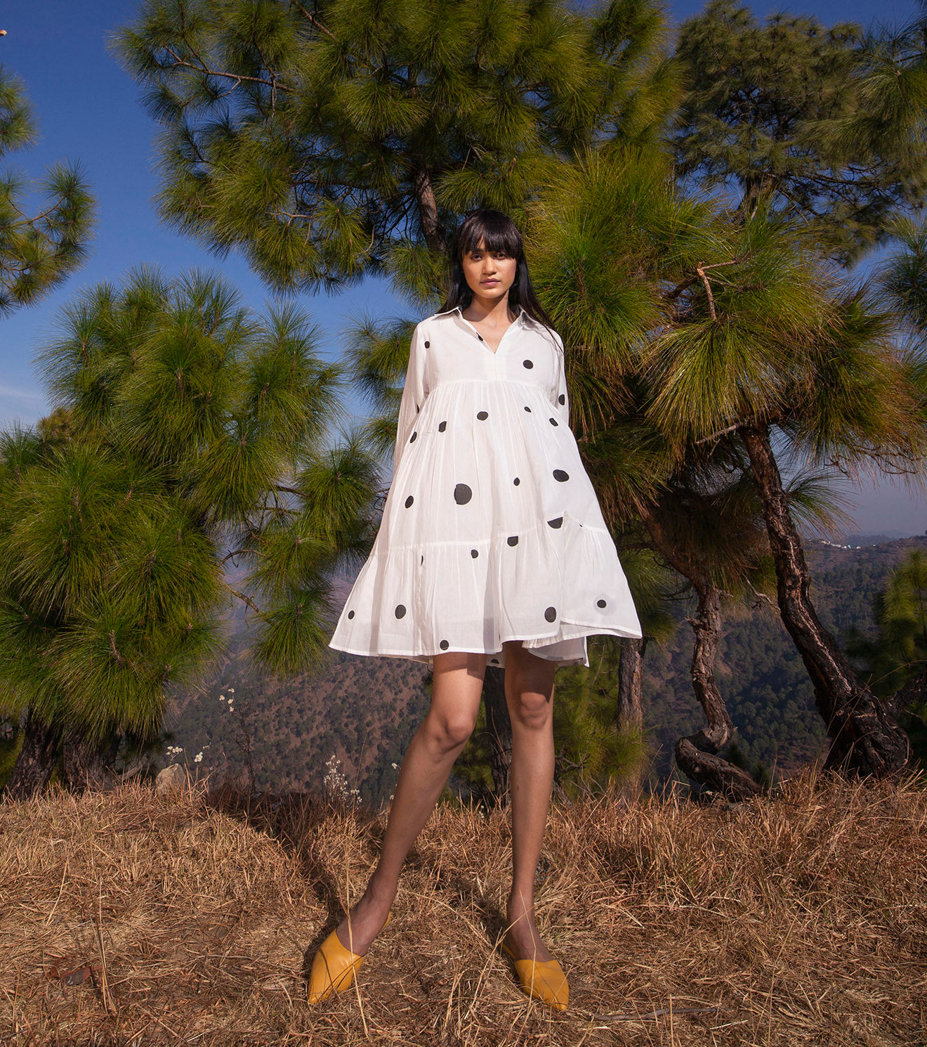 Through all that bends and breaks, you are wrapped in grace. Screen printed polka tent mini dress with a collared V-neckline, cuffed sleeves and a delicately gathered flare.