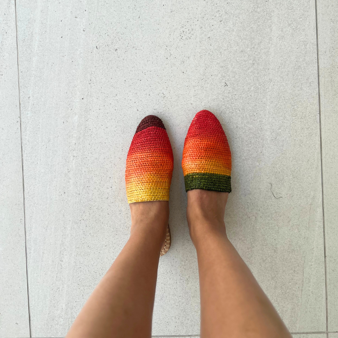 This beautiful pair of babouche Bulibasha slip ons have been hand-painted by Ana Art in beautiful vibrant shades of sunset. One of a kind pieces.