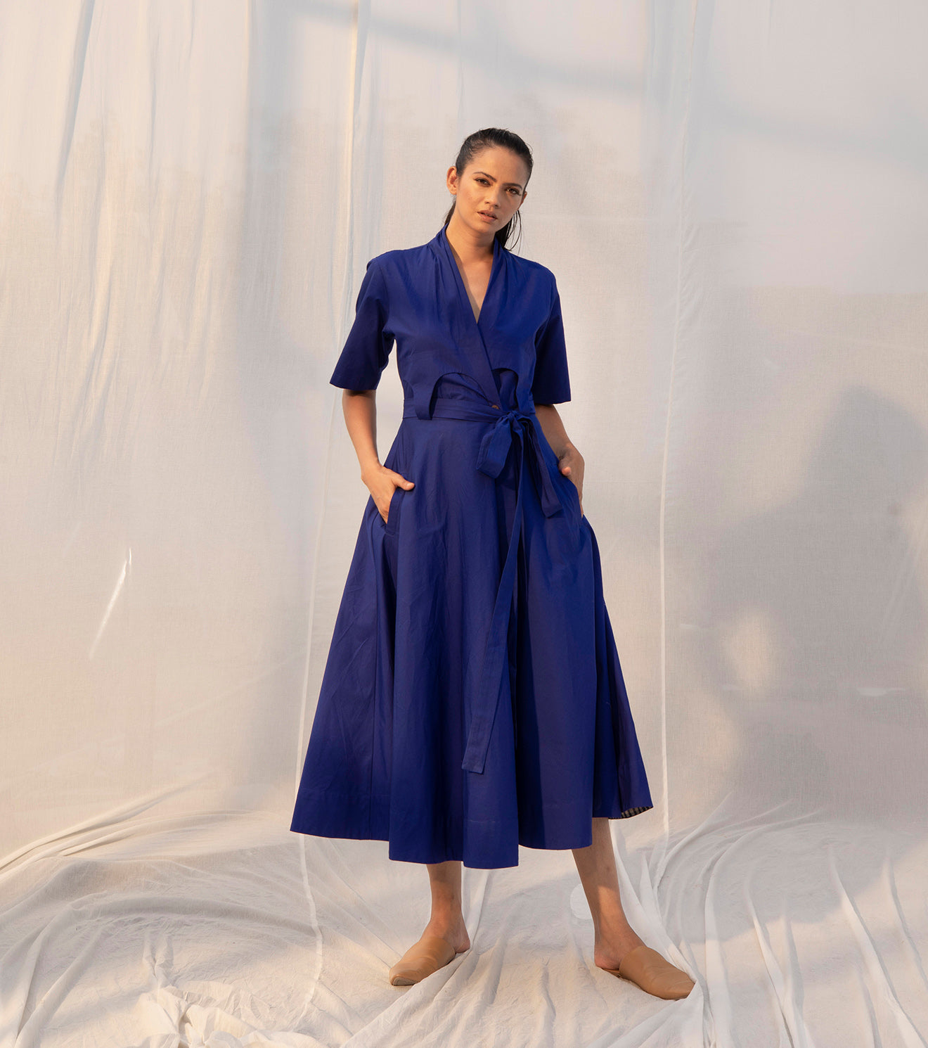 There's blue magic in everyday. It goes away and pops back again, making her tougher and taller with every single rotation of the earth. Electric Blue wrap dress with front button closure, fabric belt and side pockets. Blue ghingham detailing on inside with shawl collar.