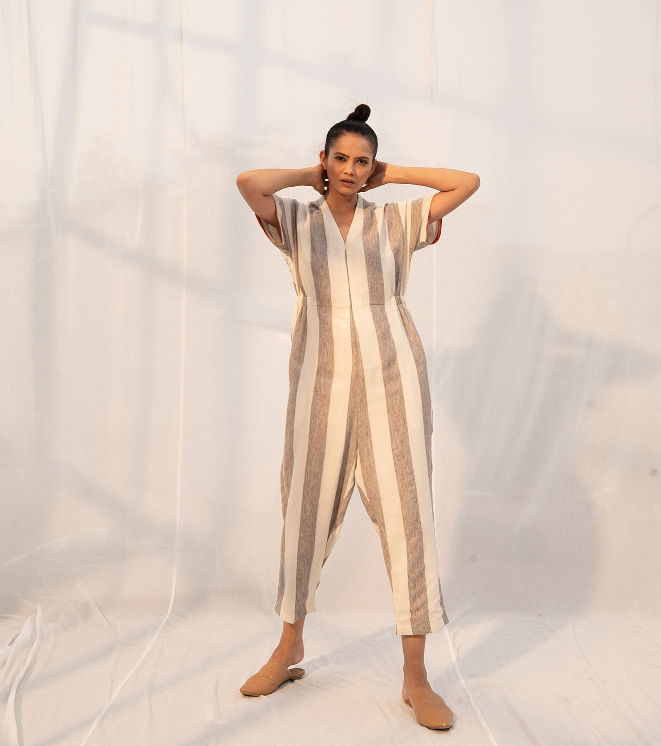 An overcast day stirring a storm in Grey and white. Handcrafted jumpsuit with ikat detailing on inside. It comes with a v-neck and front zipper opening. It has an elasticated band on each side, along with side pockets and kimono sleeves.