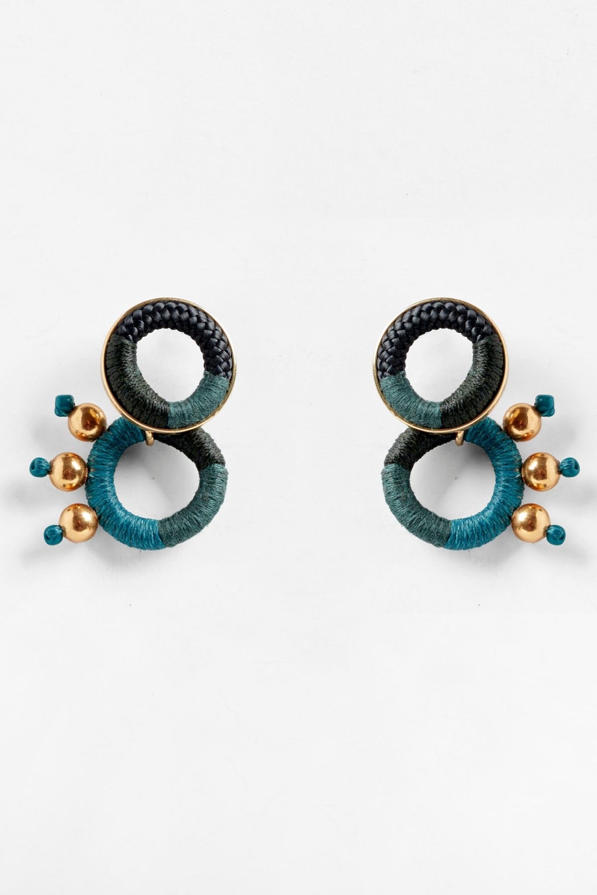 Custom brass gold plated button stud earrings with woven rope embellished with gold plated and glass beads, hand woven with wax cotton