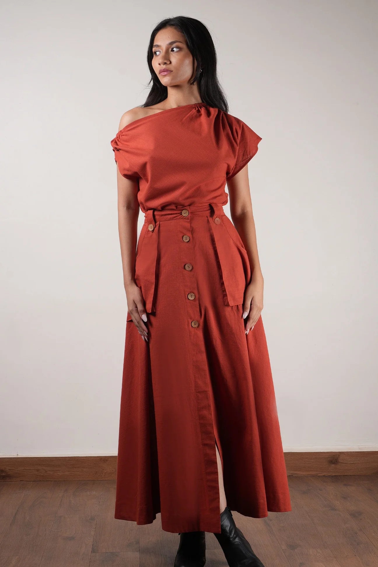 Rust One Shoulder Skirt Set